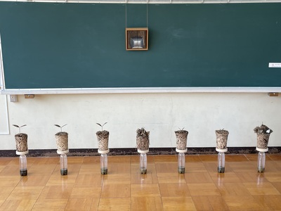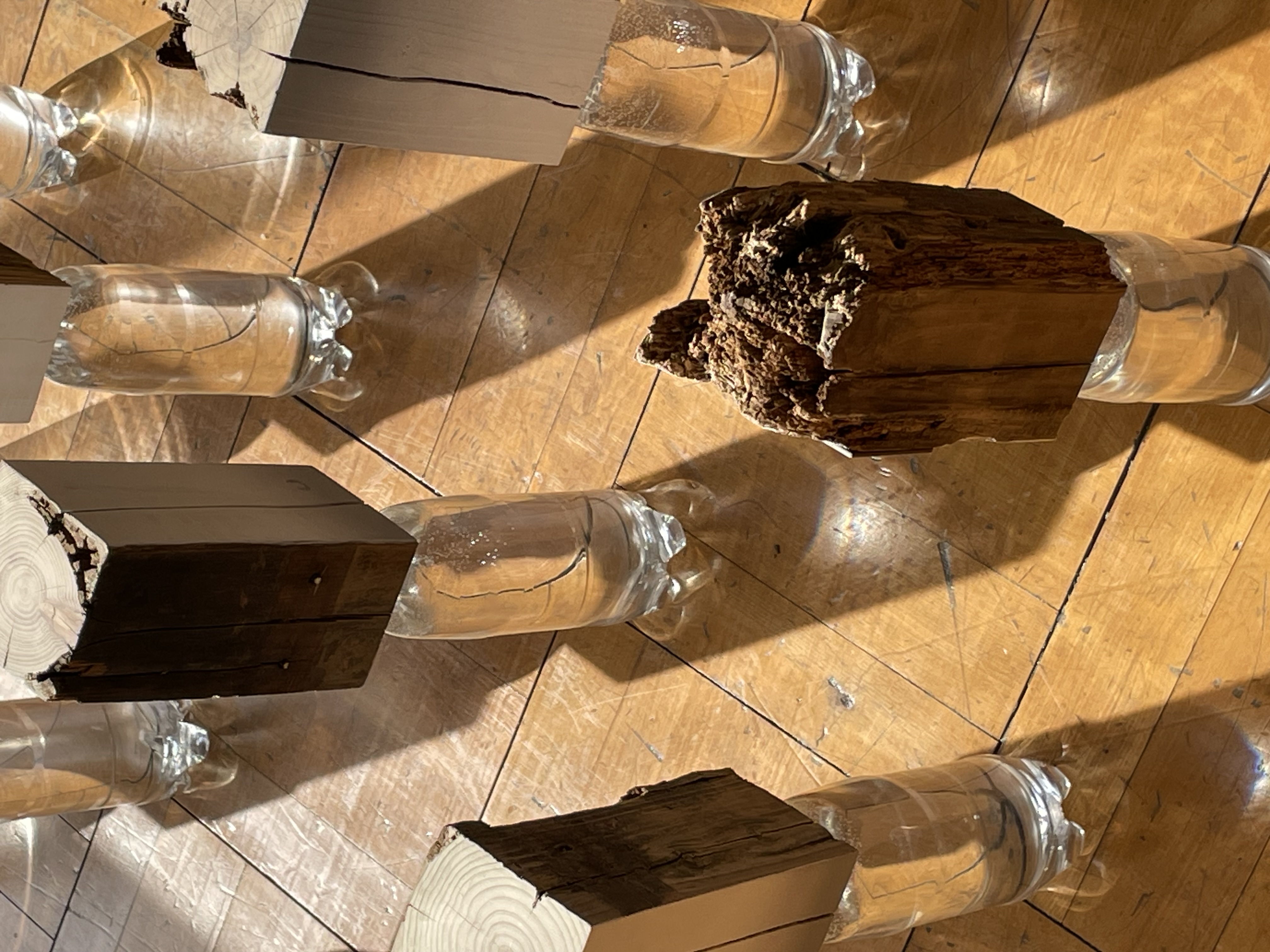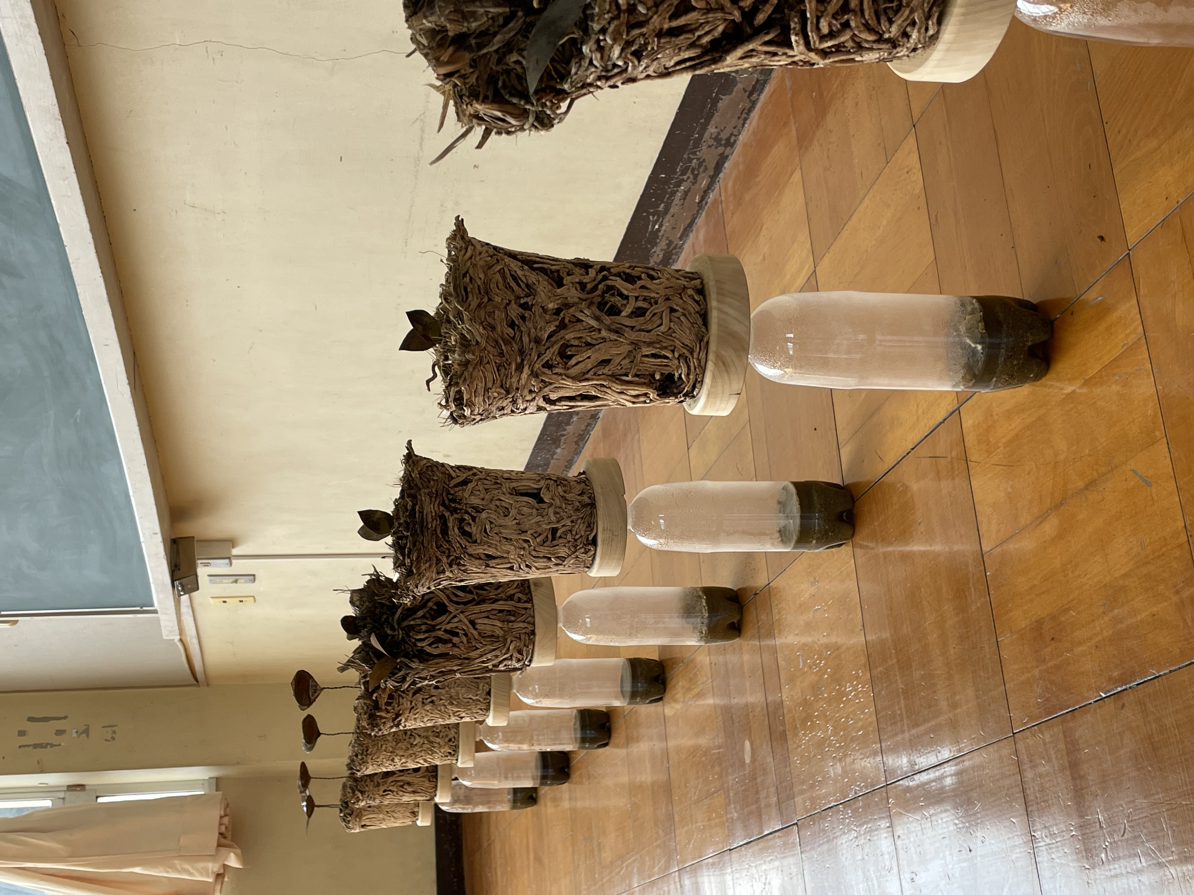 時間の経過により生まれた、根っこや朽ちた角材を見せることで、生命のはかなさやくり返し(生々流転)を再認識してもらう。自宅を建てて20数年になる、ウッドデッキに使用していた廃材から感じたことやそのとき植えたさくらんぼの木を取り除かなければいけない機会になり、いのちを奪うことになったことへの感謝の気持ちを込めて作品とする。