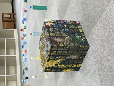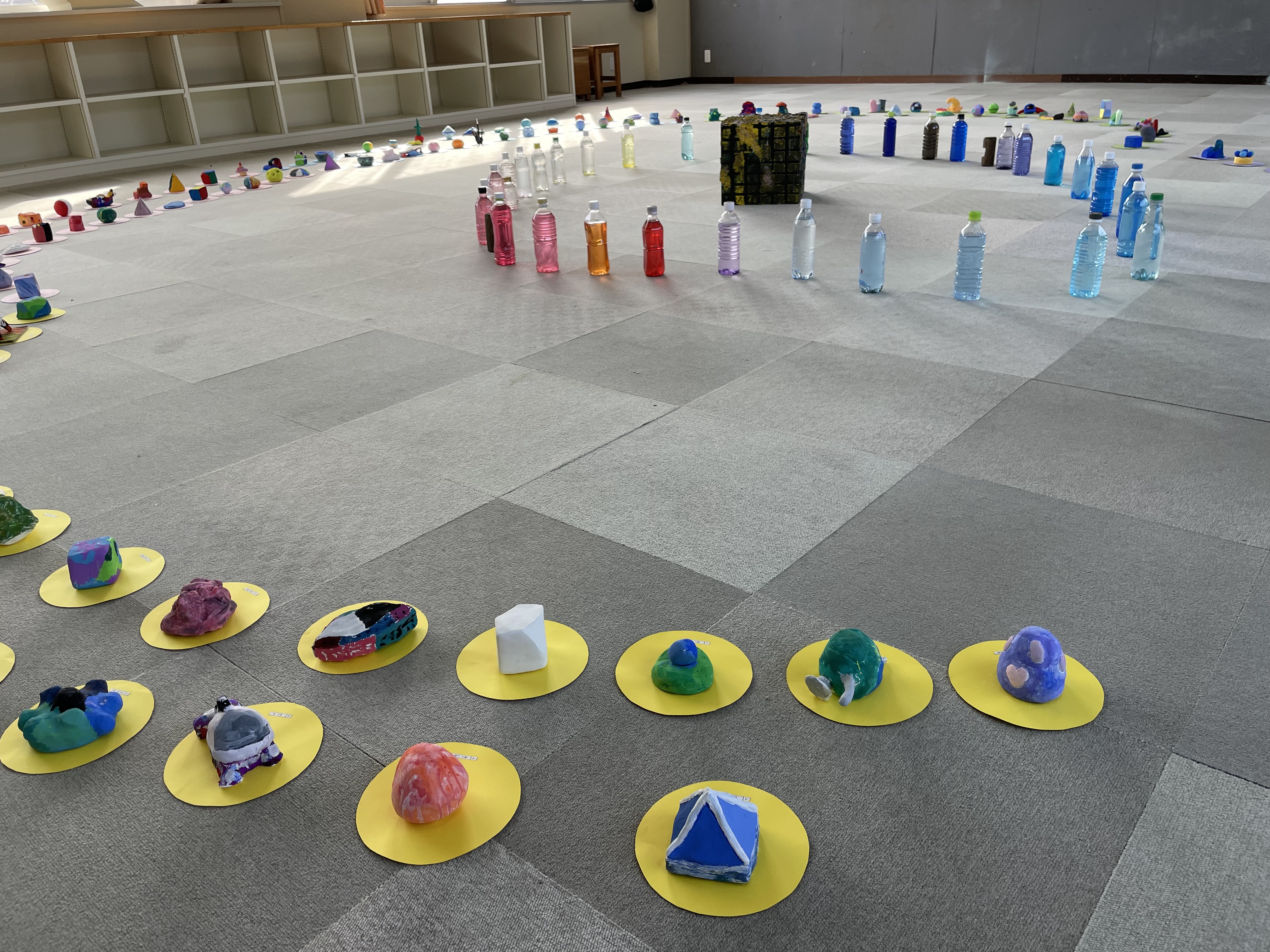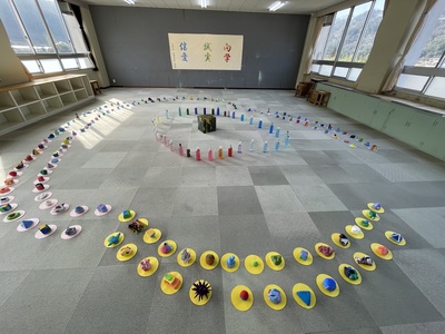 満濃中学校1年生徒作品 自分を表す色と形を考え立体作品を制作しました。 自分の作品を生み出すということは、まさに自分自身の分身を生み出すこと。 「生<inochi>」という全体テーマのもと自分自身を形と色で生み出しました。 形や色には、それぞれ見た人に与えるイメージや印象の力、自分に適性あるものが存在します。まずはそれを知り組み合わせろことを試みました。 満濃中学校1年生が一つの輪になって、新たな空間を生み出しています。